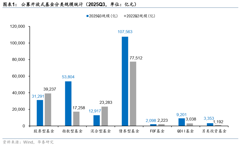 基于公募开放式基金 2025 年三季报,统计各类型基金规模(剔除货币基金)。数据显示,全市场总规模约为22万亿元,其中股票型基金(含普通股票型和偏股混合型)总规模约为 3.1万亿元,指数型基金(含被动指数型和指数增强型)总规模约为5.4万亿元,混合型、债券型、FOF、QDII 基金总规模分别为1.3、10.8、0.21、0.9万亿元。与2022年半年报相比,指数型基金、QDII基金的规模得到跨越式发展,与机构配置需求、跨境配置需求的提升相关,而股票型基金和混合型基金的规模则有所回落。