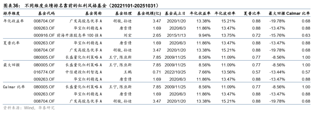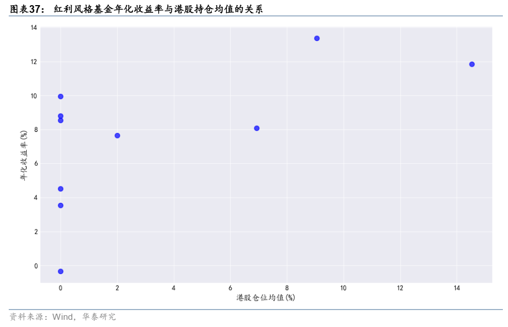 值得注意的是,价值风格中业绩领先的基金与红利风格存在重合。据此,我们将分析拓展至红利风格基金:1、选择主流红利指数,包括A股的中证红利、深证红利、上证红利、中证高股息策略指数,以及港股的香港红利、港股通高息精选、港股通央企红利、港股通高股息、恒生港股通高股息率、恒生中国内地企业高股息率指数;2、统计基金持仓中上述指数成分股的权重占比;3、选择考察期内红利风格平均持仓高于30%且最低持仓高于10%的基金。满足条件的红利风格基金一共10支(其中8支也是价值风格),合计规模20.6亿。