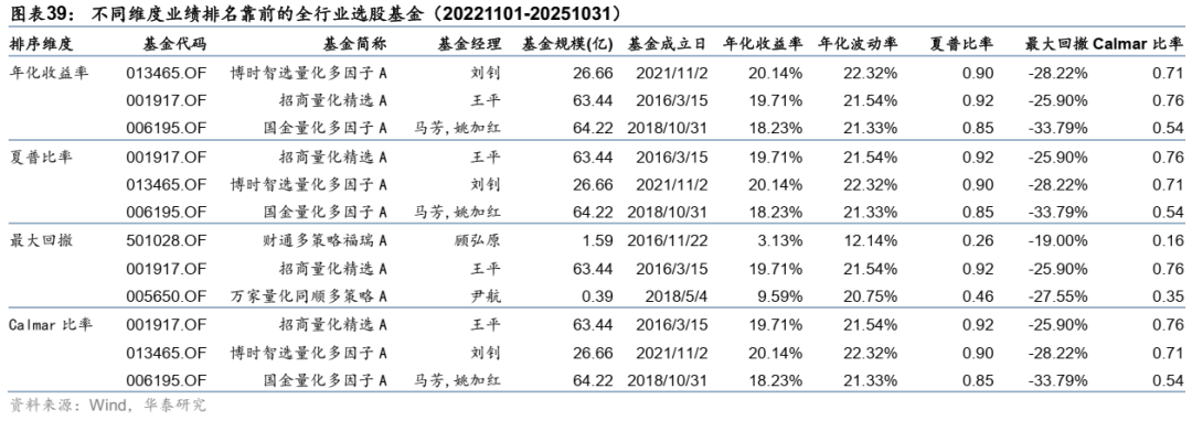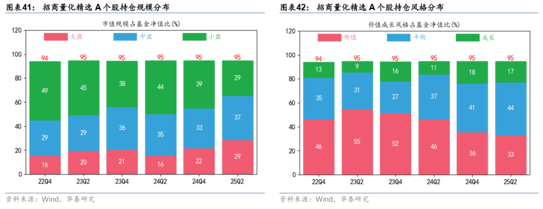 传统量化产品往往会设置明确的比较基准,通过信息比能客观反映管理人超额收益水平。但普通投资者(尤其是个人投资者)往往从绝对收益角度出发选择产品,年化收益率、夏普比率、最大回撤等指标反而更重要。全行业选股(亦称空气指增)基金不设置明确的比较基准,放松跟踪误差约束后,收益弹性空间更大,投资者持有体验可能更好,能直接对标主动权益基金,一旦做出业绩也更容易获得广泛的市场关注。实际上我们注意到,国金量化多因子A、招商量化精选A也是本文分析的所有主动量化基金中,规模最大的2支。