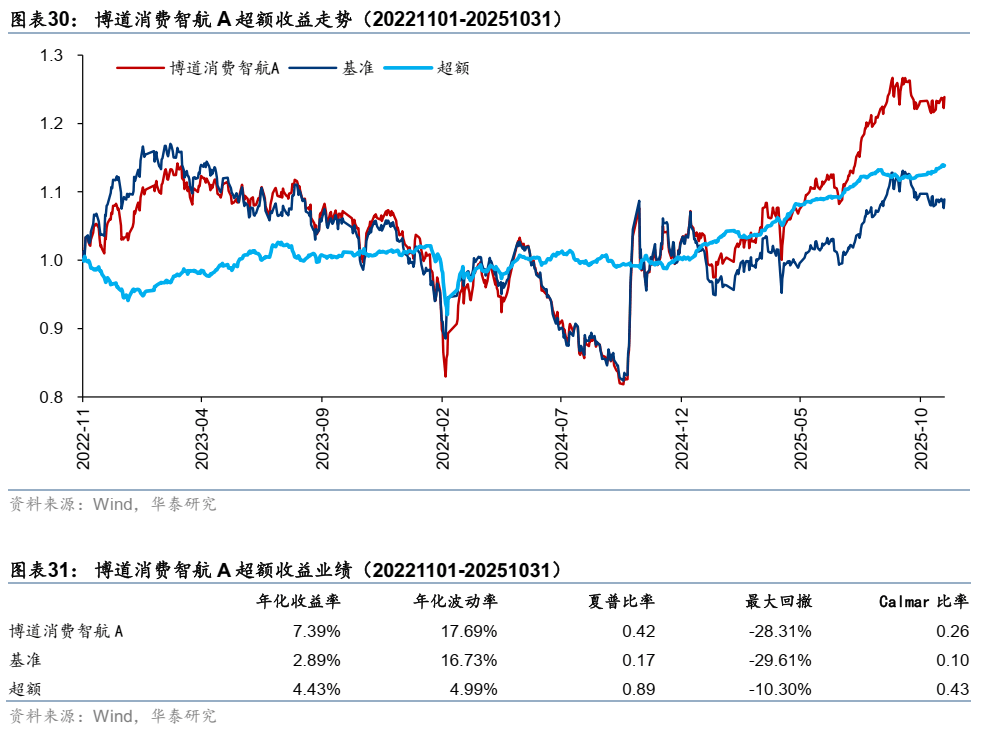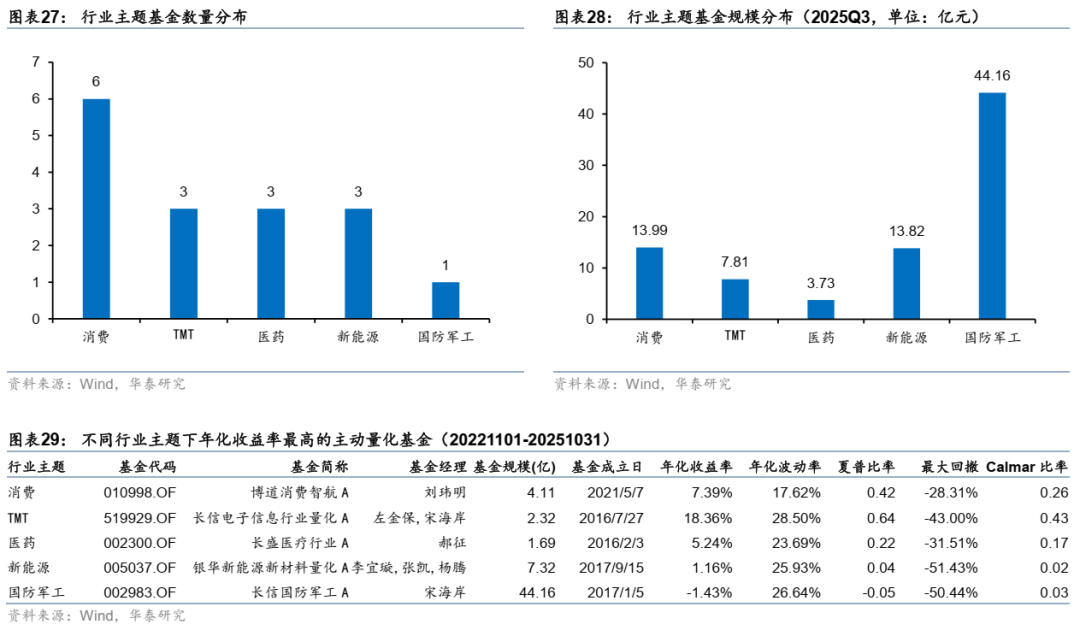 在高股票仓位+不择时的主动量化基金中剔除港股量化、类指增基金后,根据历史行业/板块持仓,筛选聚焦于单一行业/板块的主动量化基金。满足条件的行业主题基金一共16支,合计规模83.5亿元。主要覆盖了消费、TMT、医药、新能源、国防军工五个赛道。各行业主题下近3年收益最高的代表性基金如下表,绝对收益表现因行业基准而异。多数基金相比于各自基准都有一定的超额表现。以博道消费智航A为例,该基金基准为中信消费风格指数,近3年来以5%不到的跟踪误差获取了4.43%的年化超额收益率,信息比率0.89。