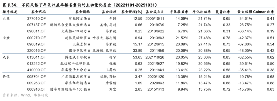 不同风格下收益排名靠前的基金如下表,考虑到大盘、成长、价值风格在主动权益基金中都能找到平替,而小盘基金一般配置个股数量较多,天然适合量化方式进行广度覆盖,所以从稀缺性的角度更值得关注。在全部6支小盘基金中,近3年年化收益率与持仓市值下沉程度显著正相关。其中,建信灵活配置A、大成景恒A、诺安多策略A的年化收益率均超过20%,平均持仓市值低于100亿元,可视作微盘股基金;而另外三支基金的平均持仓市值均高于200亿元,年化收益率均不足20%。