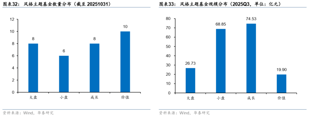 在高股票仓位+不择时的主动量化基金中剔除港股量化、类指增基金、行业主题基金后,计算各基金在不同风格上的持仓明细:1、根据万得规模风格分类,从规模维度可以将个股划分为大盘、中盘、小盘,从风格维度可以将个股划分为价值、平衡、成长;2、根据基金持仓个股占比,汇总统计各风格上持仓权重,若在指定风格上的历史持仓均值高于50%,则判定为该风格基金。满足条件的风格主题基金一共29支,合计规模178.8亿元。需要说明,规模和风格两个维度下划分的基金会有重叠,比如某基金既是大盘基金,也是成长基金。