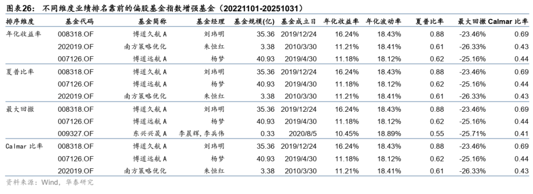 我们认为,从量化产品设计的角度,指数增强基金设置了明确的比较基准,通过信息比率指标能客观反映管理人超额收益水平,对于投资者(尤其是机构投资者)而言逻辑清晰,工具属性强。而类指增基金的定位与指增基金有重叠,尽管也“隐性”的设定了比较基准,但对普通投资者而言存在一定的认知壁垒,如果业绩没有明显优势,较难获得广泛的市场关注。因此在产品布局时,选择差异化的“基准”更能事半功倍。而以偏股基金指数作为基准的类指增产品定位就具备“差异化特征”,既没有相应的指数增强产品,也没有直接的被动产品获取该beta,对于想获取公募偏股基金整体回报的投资者而言,是一个高效、便捷的投资工具。