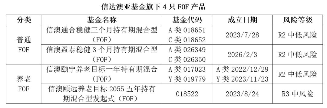 基金定期报告显示,信澳颐远养老目标2055五年持有期混合型发起式(FOF)A2025年收益率达27.97%,相比业绩比较基准收益率15.01%的表现具有显著超额;信澳通合稳健三个月持有期混合型(FOF)A、信澳颐宁养老目标一年持有期混合(FOF)2025年收益率分别为6.67%、8.23%,业绩比较基准收益率为6.05%、4.80%,另据银河证券数据显示,截至2026年1月31日,两只产品近1年收益率分别在混合型FOF(权益资产0-30%)(A类)、养老目标风险FOF(权益资产0-30%)(A类)中排名前1/5(13/70)、前1/3(23/83)。
