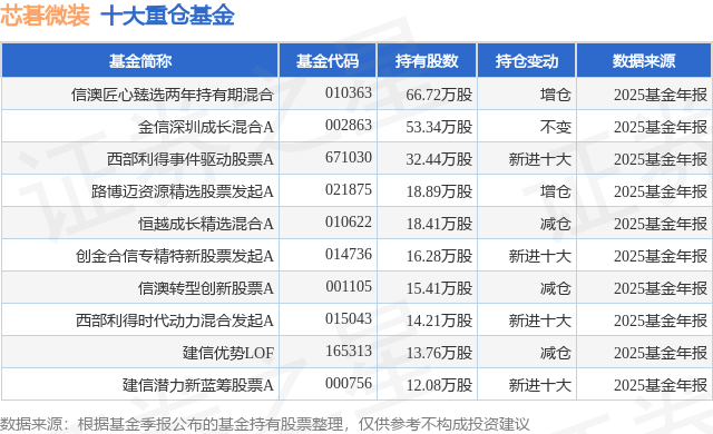 根据2025基金年报公募基金重仓股数据,重仓该股的公募基金共42家,其中持有数量最多的公募基金为信达澳亚基金的信澳匠心臻选两年持有期混合。信澳匠心臻选两年持有期混合目前规模为14.93亿元,最新净值1.5238(4月7日),较上一交易日上涨1.09%,近一年上涨78.35%。该公募基金现任基金经理为朱然。朱然在任的基金产品包括:信澳转型创新股票A,管理时间为2021年12月20日至今,期间收益率为34.45%;信澳智选先锋一年持有期混合A,管理时间为2022年6月14日至今,期间收益率为18.99%;信澳汇智优选一年持有期混合A,管理时间为2022年11月22日至今,期间收益率为53.24%。