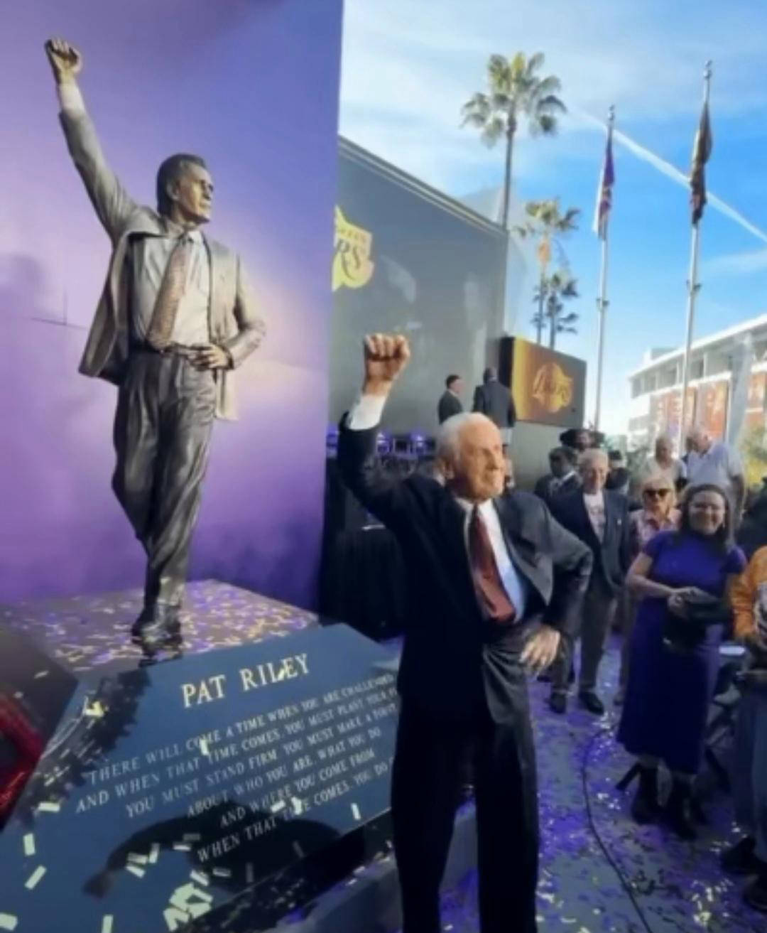 这座雕像高达2.4米,从细节处完美还原了莱利当年经典造型:油亮的发型、皮带系法、西装裁剪以及他庆祝胜利时那振臂高呼的姿态,无不体现出他的风采。帕特本人对此赞赏有加,更是兴致盎然地与雕像合影,摆出昔日经典动作,令现场的嘉宾和老球迷纷纷拍手称好。在落成典礼上,多位昔日名宿也分享了与莱利共事的趣闻轶事,回忆那些艰苦而辉煌的岁月。韦德随后还在社交媒体上发布了与莱利合影的照片,并真诚表达了能在这位教练麾下效力的荣幸之情。
